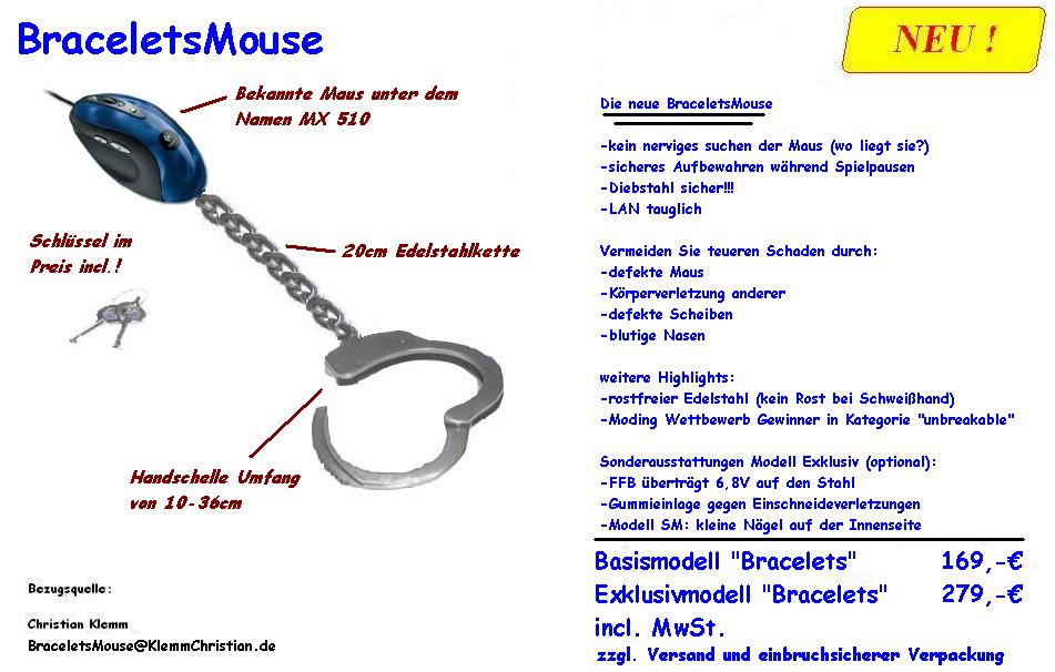 BraceletsMouseDie Idee dieser Maus kam durch einen Forumpost vom Azreal der an Logitech schrieb das seine Maus aus 80cm vom Tisch gefallen ist und nach dem Öffnen es feststellen musst das da etliches defekt war. Logitech lehnte durch das Öffnen jegliche Garantie ab. Also war es meine Aufgabe eine Maus zu entwickeln die nicht vom Handgelenk kann