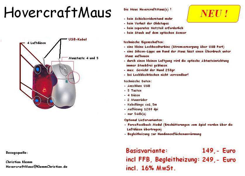 Neue Mäuse braucht das LandHoverCraftMouseDie HoverCraftMouse ist enstanden in der Kantine der Meisterschule: Ein Klugscheisser³ lauschte unserer Unterhaltung über Mäuse, Gelpads und den Widerstand der Maus beim bewegen, da meinte der Klugscheisser³ seine Maus hätte keinen Widerstand, darauf beschrieb ich das das wohl eine HoverCraftMouse sein muss mit Staubsaugerschlauc der Luft unter die Maus blässt. Nun lachten wir und im Unterricht baute ich ein Prospekt von so einer Maus, die Idee wurde verfeinert und es tauchte eine Frage auf die mich schockte: "Was soll die kosten?" Nun musste ich einen hohen Preis veranschlagen um nicht Gefahr zu laufen das sie doch jemand wollte! Die Frage vom "Vassi" (Aus der Meisterschule) war Ernst gemeint!!!